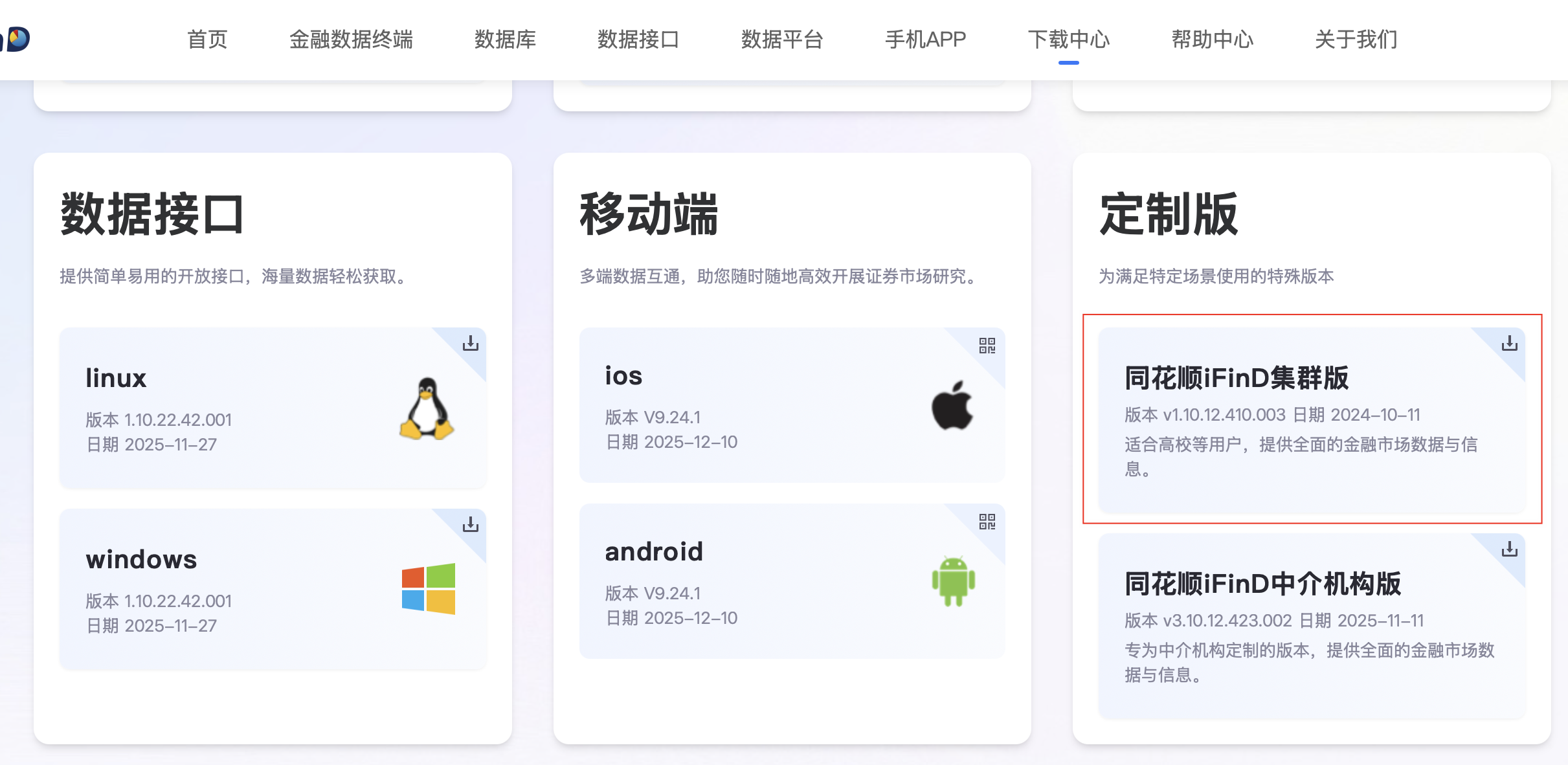 点击定制板块中的“同花顺iFinD集群版”客户端进行下载安装